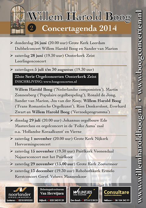 ©2012 Commissie Orgelconcerten Willem Harold Boog. De website van Willem Harold Boog is met de grootst mogelijke zorgvuldigheid samengesteld. Uit oogpunt van onze menselijkheid is het echter niet honderd procent uitgesloten dat de informatie -onbedoeld- onjuistheden bevat. Heeft u opmerkingen of vragen als reactie op deze website? Neemt u gerust contact met ons op.